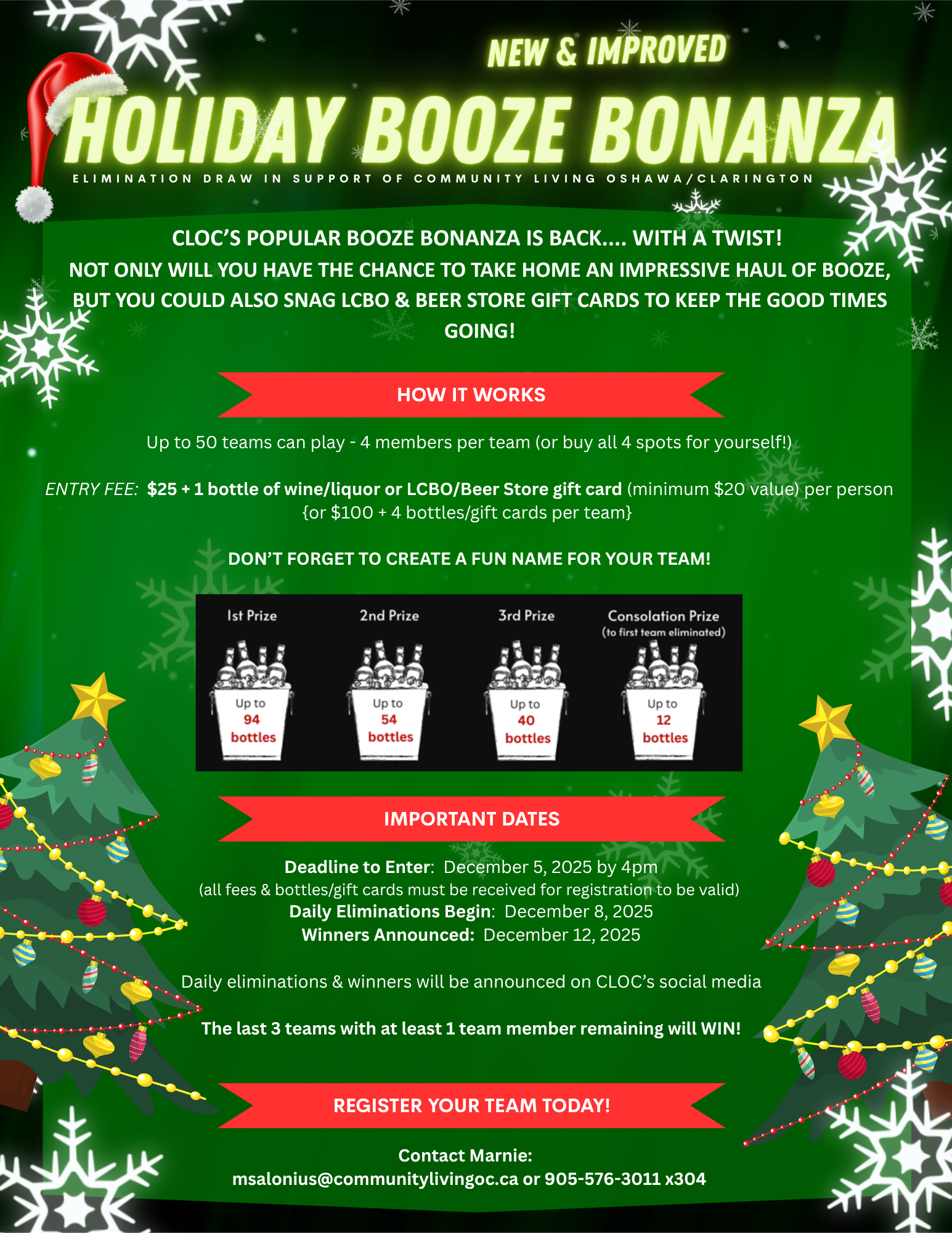 CLOC’s Holiday Booze Bonanza is back… with a twist! Not only will you have the chance to take home an impressive haul of booze, but you could also snag LCBO and Beer Store gift cards! Register by December 5th at 4pm (form attached). Winners will be announced December 12th.